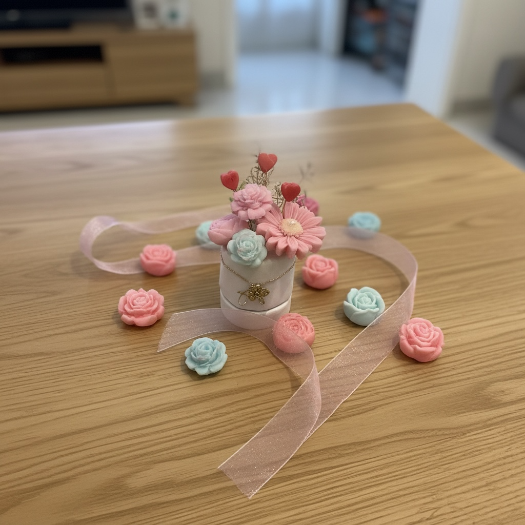 This elegant gift set features a charming handcrafted resin pendant paired with a mini candle flower bouquet, creating a perfect blend of beauty and creativity. Designed for thoughtful gifting, it suits birthdays, return gifts, festive occasions, and special surprises.
