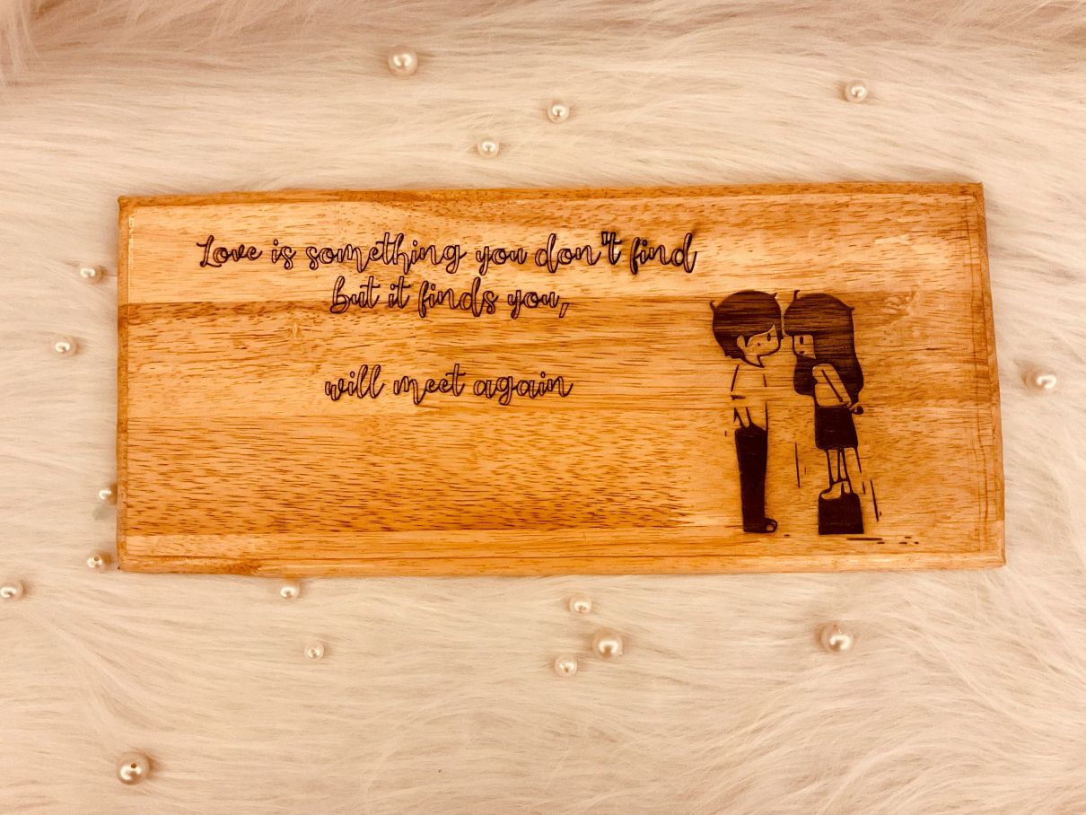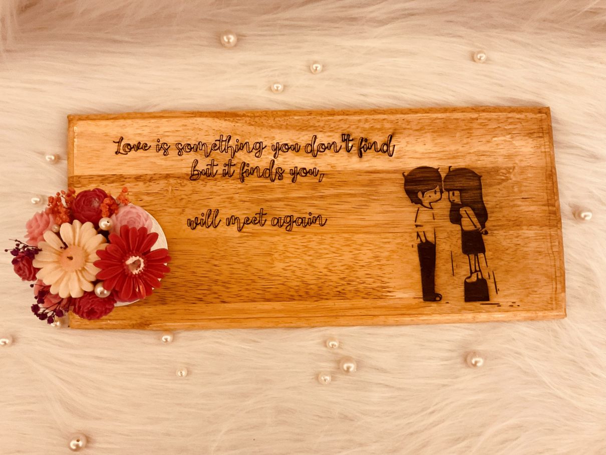 The smooth polished finish enhances the natural wood grains, giving it a rich and timeless look. On the right side, a delicately engraved romantic couple illustration adds a charming and emotional touch, making it perfect for bedrooms, living rooms, or as a thoughtful gift.